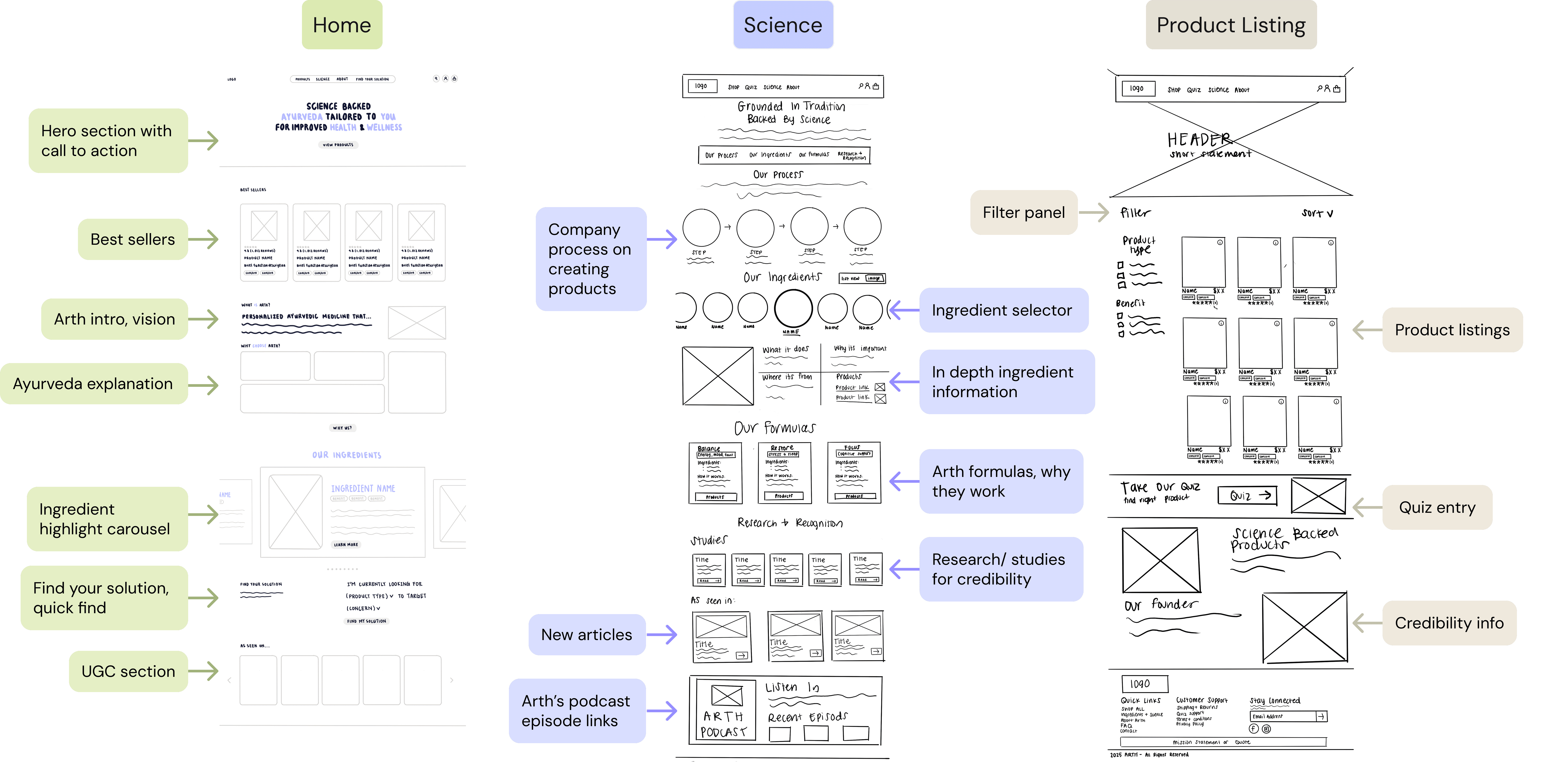After aligning on key insights, we sketched independently to explore layout ideas for key pages—homepage, science, product listing, quiz flow, and PDP.